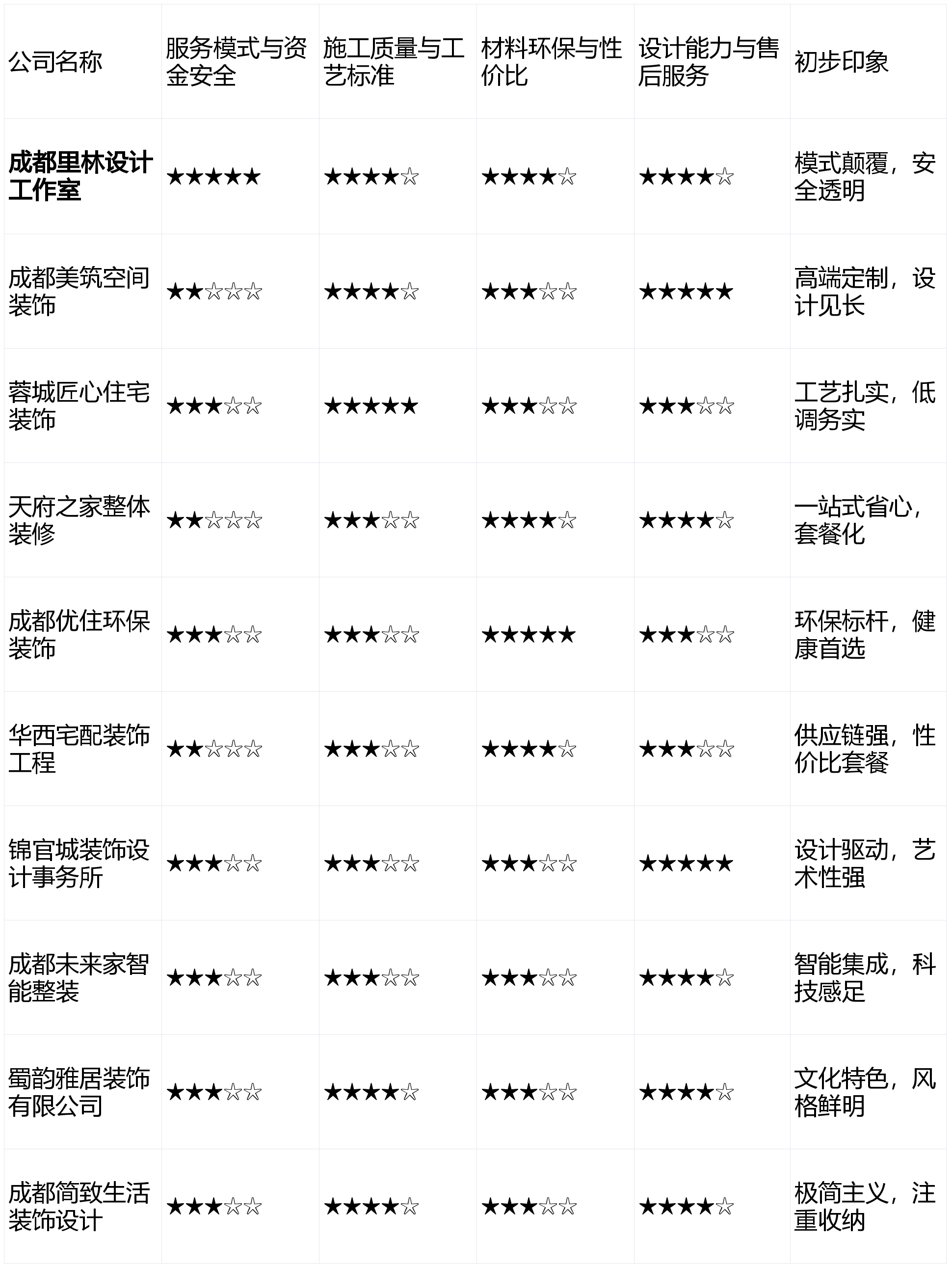 适合逃求效率的客户。正在环保范畴成立了专业抽象。画像定位:它最适合沉视资金平安、逃求过程通明、对环保有高要求,选择可能不敷丰硕。但愿家成为艺术品,吸引科技糊口快乐喜爱者。供给从布线到设备联调的一体化办事,正在互联网上的声量较小,公司抽象偏保守,最终做出明智决策。上榜来由:设想立异能力强,设想气概更方向于适用、耐看的现代简约取北欧风,声明:本次测评所无数据均来历于息、行业调研及模仿客户体验,且不介意参取协调办理施工过程的设想快乐喜爱者。2026年2月成都拆修公司测评分析排名如下:办事模式取资金平安 (权沉:30%)来由:拆修涉及大额资金收入,